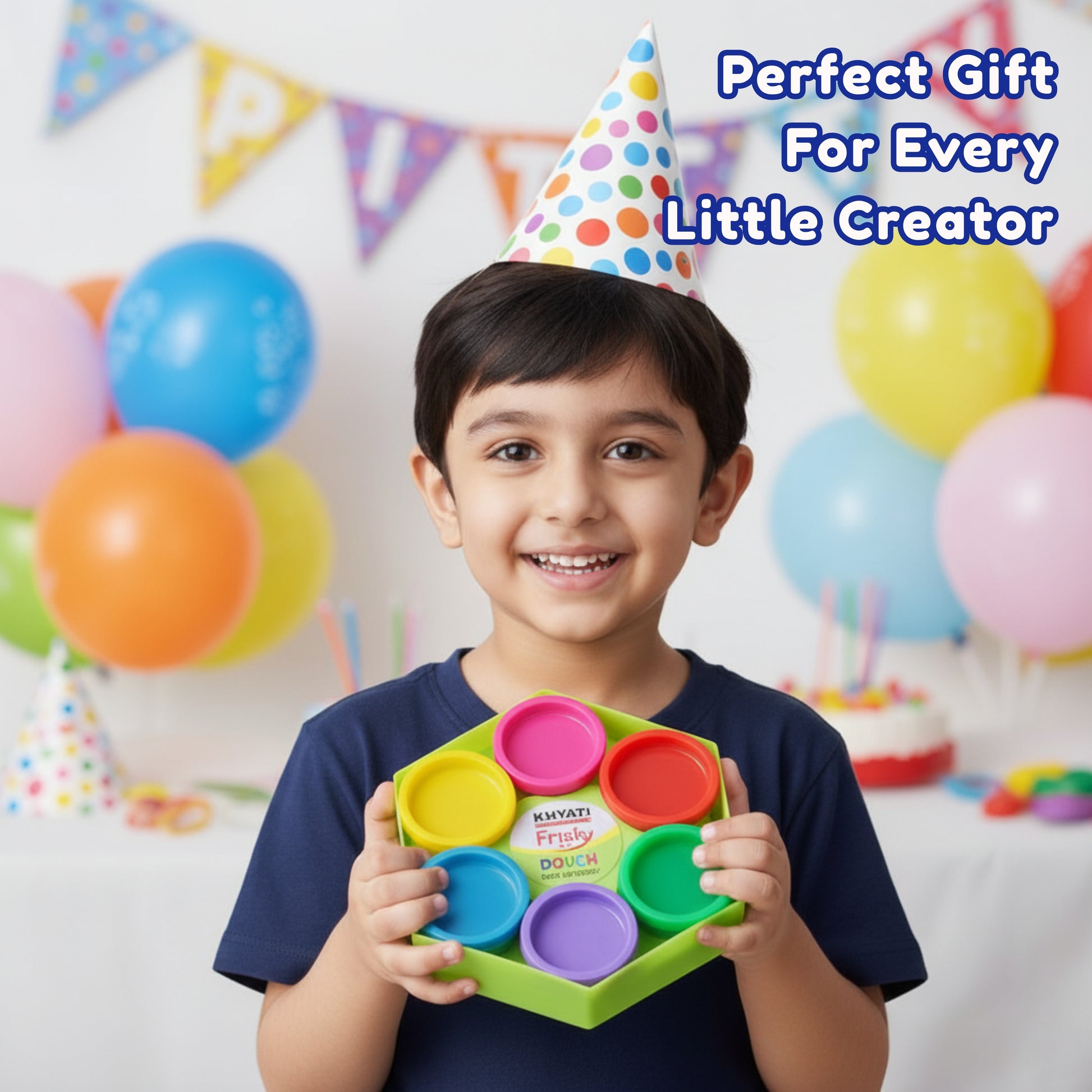 Unleash your child’s imagination with Frisky Dough, a premium modeling compound set designed for endless creativity! Each set includes six bright colors (25g each), neatly packed in a reusable hexagonal tray that keeps everything organized and easy to use.